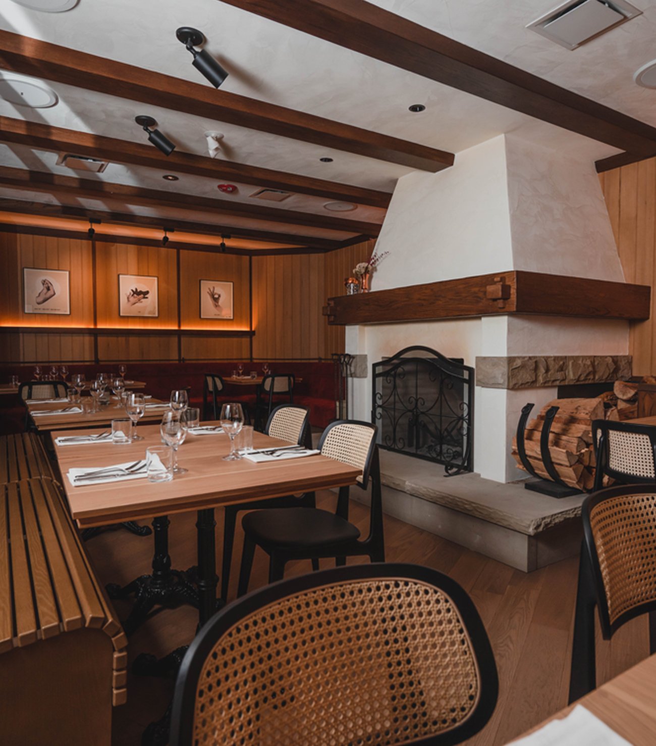 24 seated / tables of 8-10 / chef display kitchen / fireplace